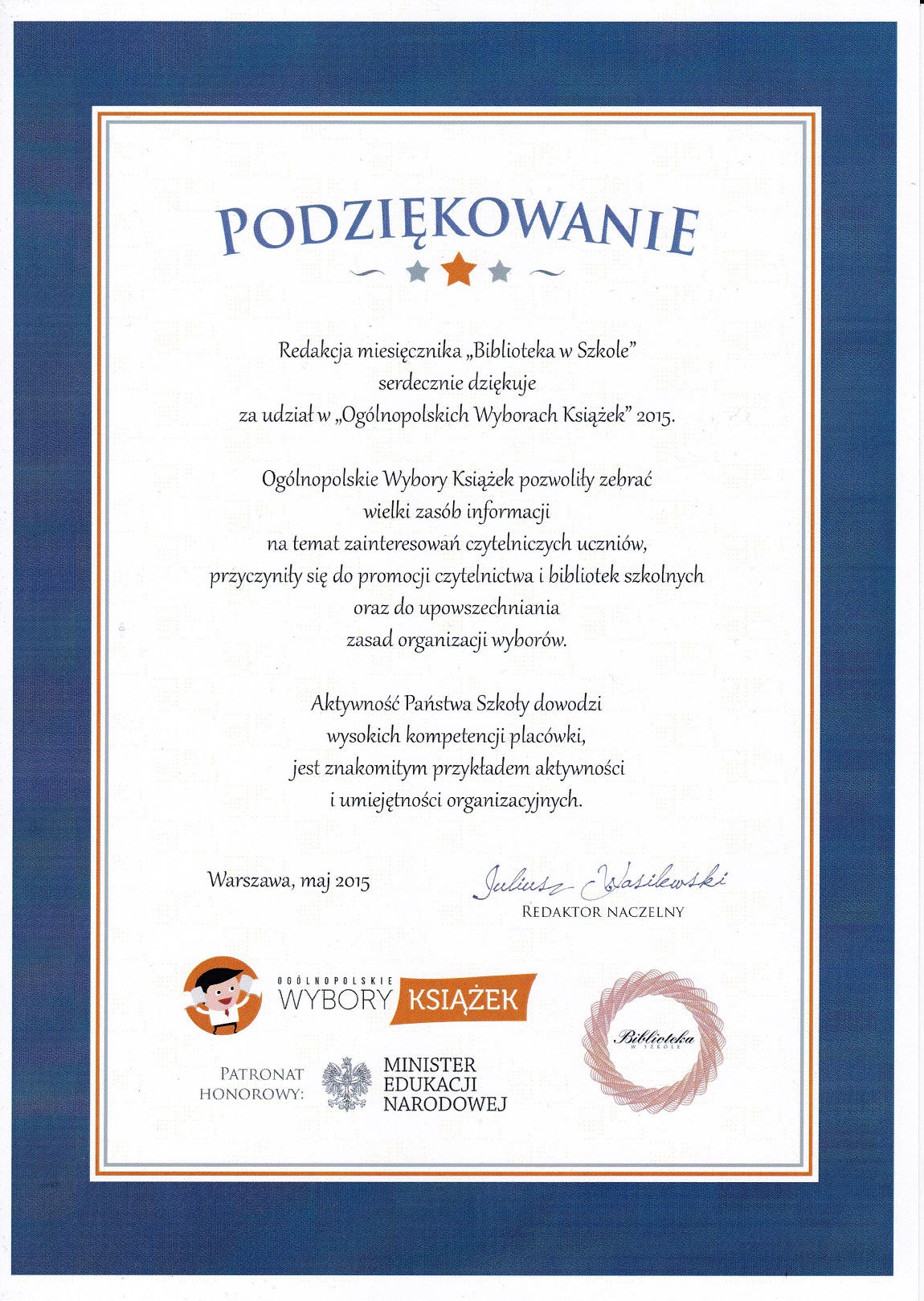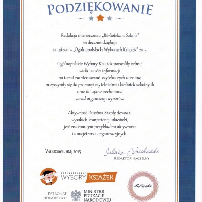 Edycja „Szkoła z Klasą 2.0” 2014/15 r. dobiegła końca, a do Dyrektora szkoły mgr inż. Arkadiusza Skiby nadal napływają podziękowania. Juliusz Wasilewski – redaktor naczelny miesięcznika „Biblioteka w Szkole” serdecznie podziękował za udział w „Ogólnopolskich Wyborach Książek” – przeprowadzonych w naszej szkole w ramach programu „Szkoła z Klasą 2.0”. Przyczyniły się one do promocji czytelnictwa i bibliotek szkolnych, a także zebrały wielki zasób informacji na temat zainteresowań czytelniczych uczniów.