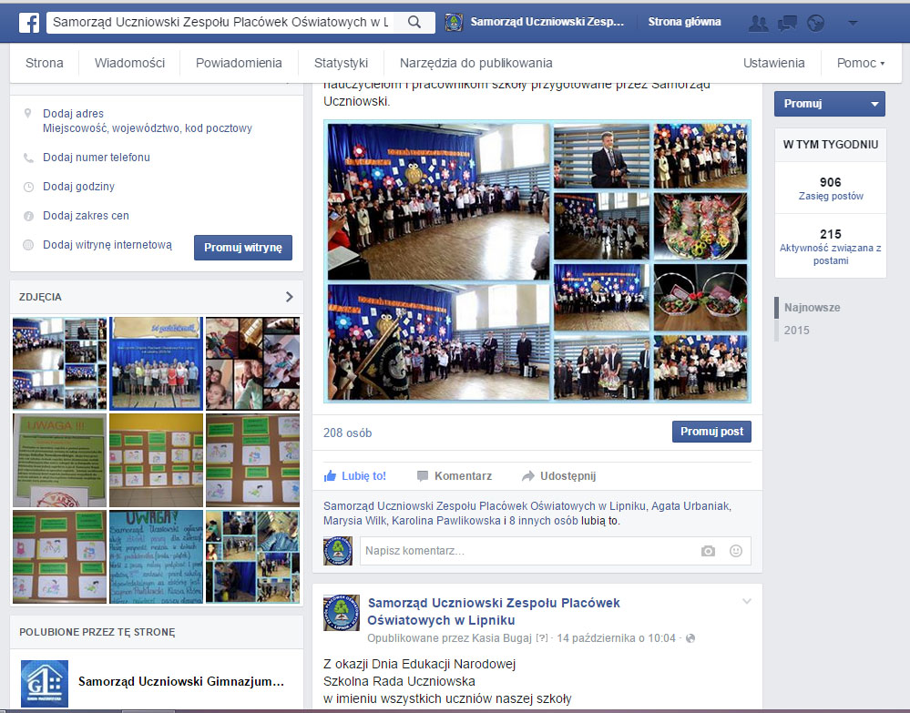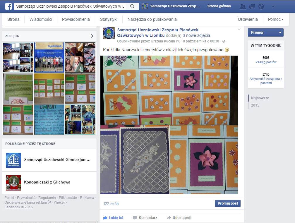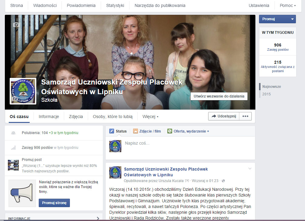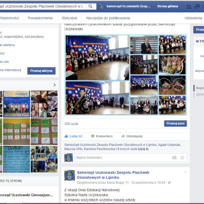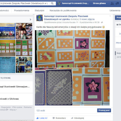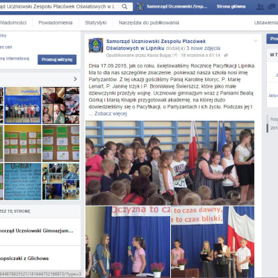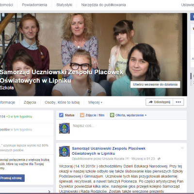 W dniu 18 września dwie uczennice z klasy III gimnazjum założyły stronę Samorządu Uczniowskiego na Facebooku. Opisują na niej wszystkie ważne wydarzenia z życia szkoły i informują o pracy samorządu. Artykuły są bardzo ciekawe, bo pisane przez samych uczniów. Na stronie można też oglądnąć zdjęcia i poczytać szereg komentarzy. Strona cieszy się dużą popularnością. Zapraszamy wszystkich zainteresowanych do odwiedzenia naszej strony.