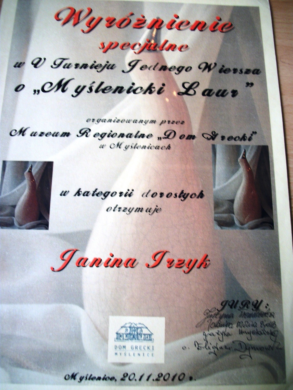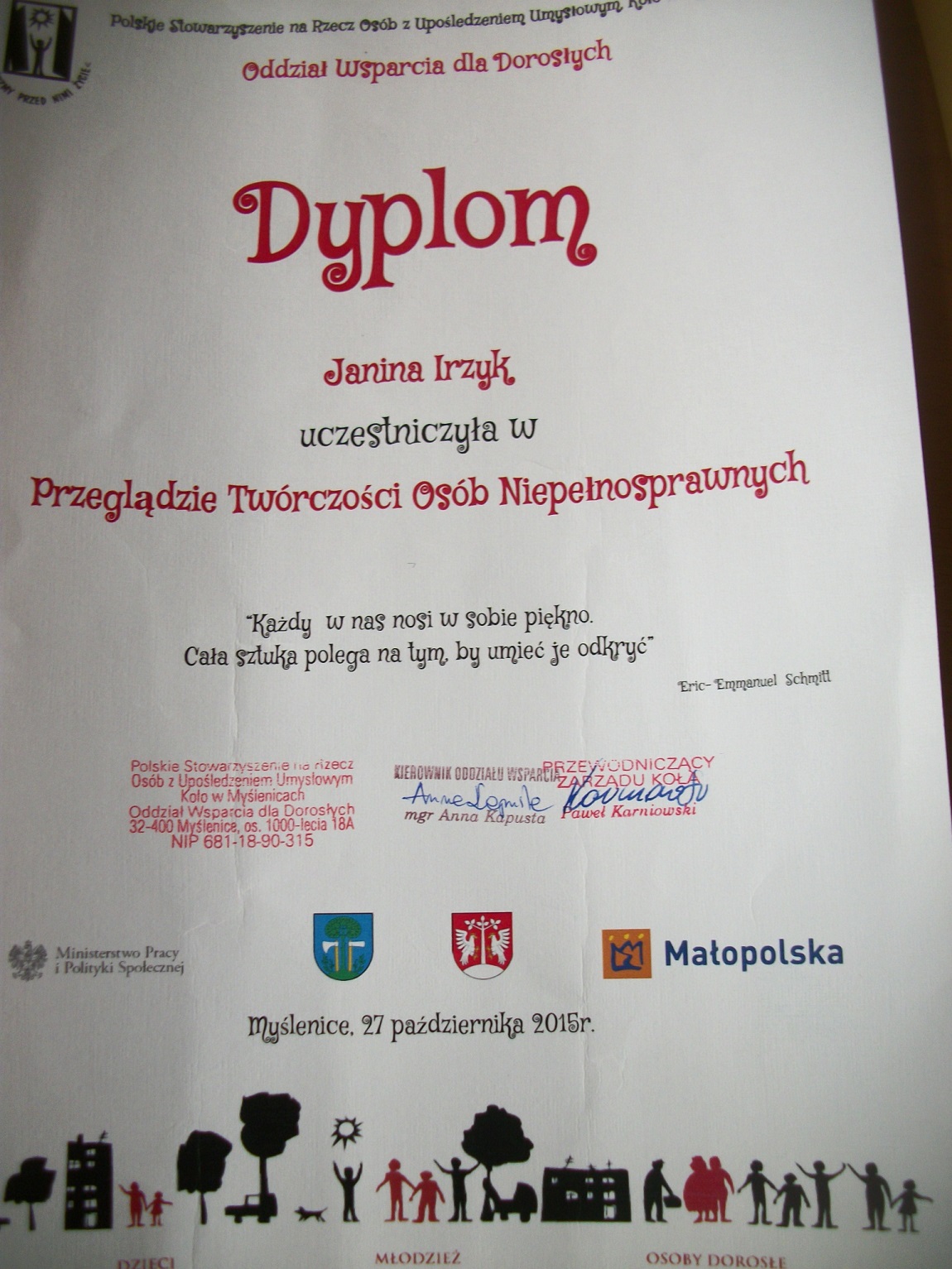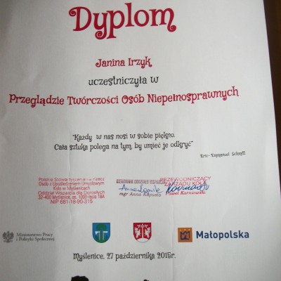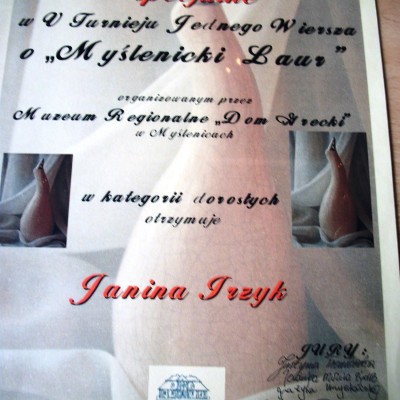 Podczas spotkania recytowała z pamięci napisane przez siebie piękne wiersze m. in. ”Anioł”, „Papież JP II”, zaprezentowała napisaną przez siebie Kronikę Lipnika – „Moja wioska Lipnik”. Podkreślała, jak ważne jest uczestnictwo w różnego rodzaju konkursach – wzmacnia wiarę we własne siły, daje poczucie własnej wartości i niesie radość, zwłaszcza z własnej twórczości, ale i jest integracją, a także wymianą myśli  z innymi autorami. Opowiadała  o niezwykłych przeżyciach duchowych jakie niosą wieczorki poetyckie i spotkania autorskie, w których z największą przyjemnością uczestniczy. Jej wiersze były wielokrotnie drukowane w Gazecie Myślenickiej tzw. Okienku lirycznym.