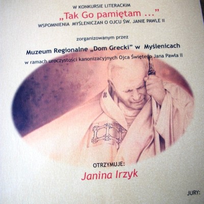 Pani Janina jest kobietą niezwykłą – jak sama mówi – dzień bez napisania wiersza byłby dla niej dniem straconym. W młodości chciała zostać nauczycielką, ale czas biedy powojennej na wsi spalonej przez Niemców, gdzie mieszkała, przeszkodził jej w realizacji planów życiowych.Za to zawsze jest chętnym gościem w szkole – różnego rodzaju spotkań, m.in. uczy dzieci rękodzieła ludowego. Podarowała dzieciom piękne kwiaty bibułkowe, a od nich otrzymała wspaniałą książkę – „Księgę mojego rodu” do wypełnienia, bo uwielbia pisać także wspomnienia. Księga ta zawiera tak ciekawe rozdziały jak: Ciekawostki z życia; Tradycyjne rodzinne  przepisy; Jak leczyli się moi przodkowie; miejsca na wklejenie zdjęć itp.