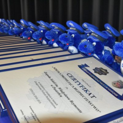 Przy uroczystym akompaniamencie werbli mgr inż. Arkadiusz Skiba – Dyrektor ZPO w Lipniku, mgr Teresa Bobowska – koordynator szkolny projektu Zintegrowanej Polityki Bezpieczeństwa, uczennica Oliwia Irzyk – przewodnicząca SU, otrzymali Certyfikat, grę dydaktyczną oraz maskotkę „Inspektora Wawelka”, a także przyjęli gratulacje za całość działań podejmowanych na rzecz bezpieczeństwa uczniów.