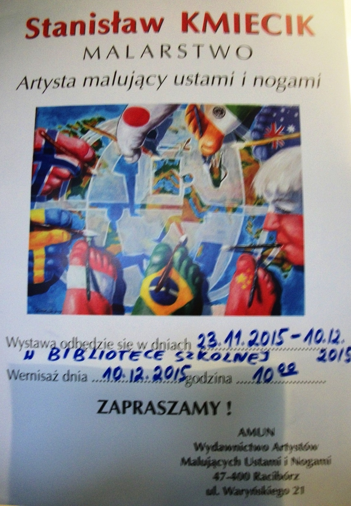 Spotkanie z malarzem i wernisaż jego prac odbędą się 10.12.2015 r. w Sali gimnastycznej.
