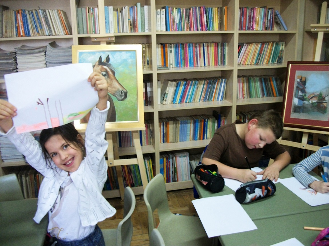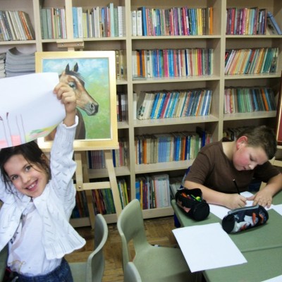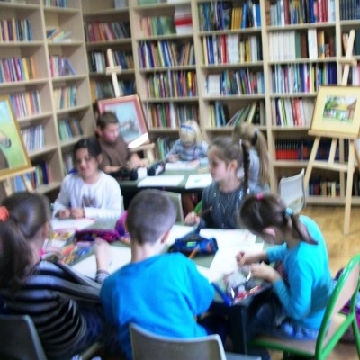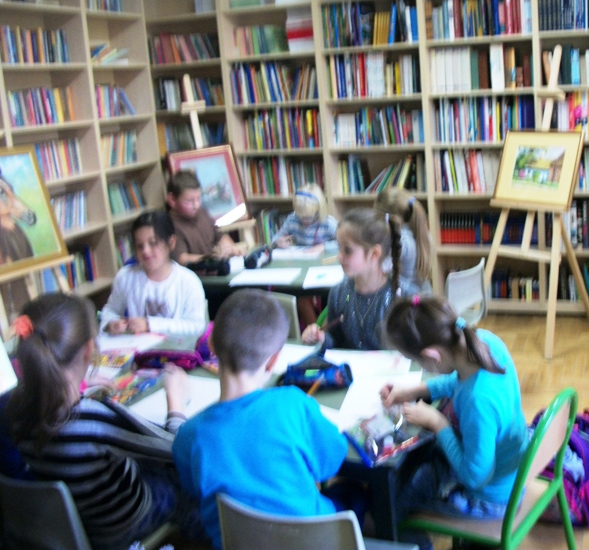 Tak też było w czwartkowe południe, kiedy grupa świetlicowa z kl.II b miała okazję podziwiać wystawę, zapoznać się z niezwykłym życiorysem i stylem życia artysty. Uczniowie sami podawali przykłady podobnych, lecz rzadkich życiorysów twórców, znanych im z programów telewizyjnych. Z wielkim zainteresowaniem i niewielką pomocą nauczyciela zapoznawali się z innymi dziełami sztuki malarza poprzez Internet. Chętnie rozmawiali o uchwyconym przez autora nastroju na oglądanych obrazach. Zainspirowani dziełami p. Stanisława Kmiecika z wielką pasją tworzyli własne rysunki, wkładając w swoją pracę wiele serca.