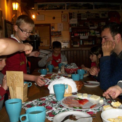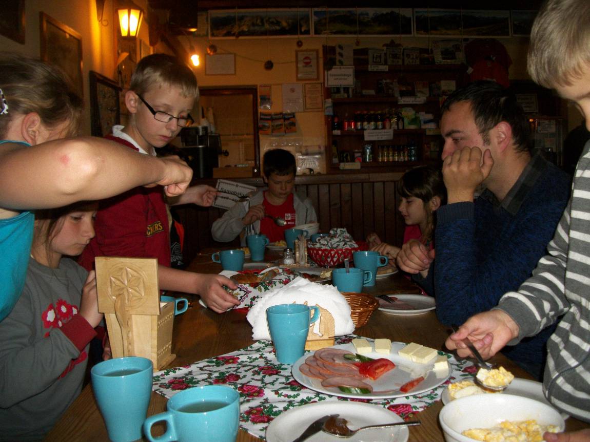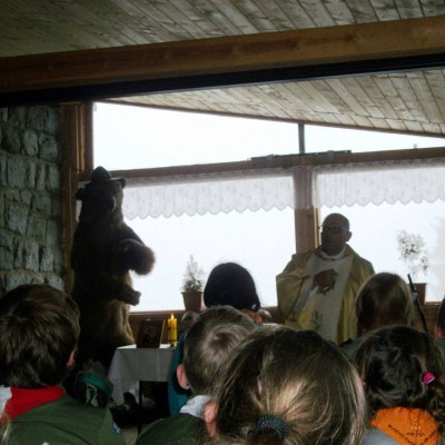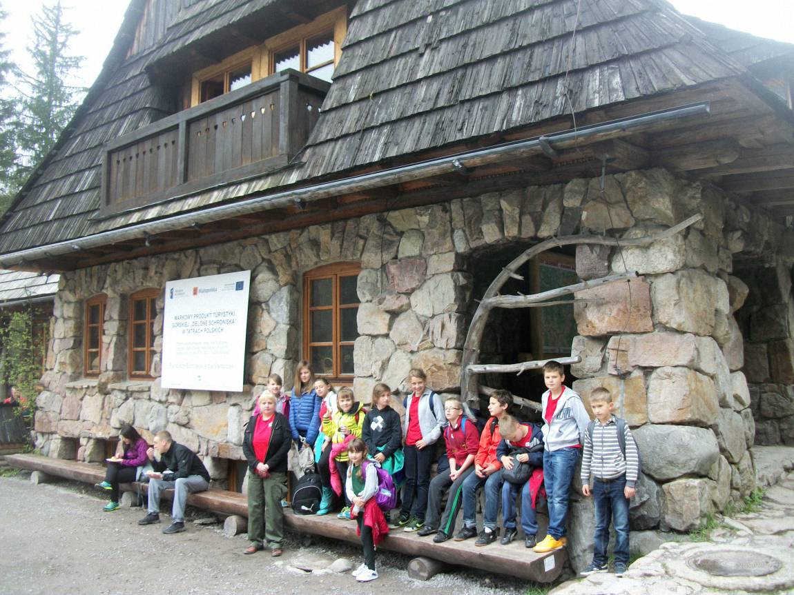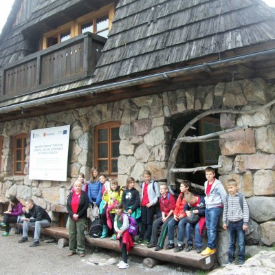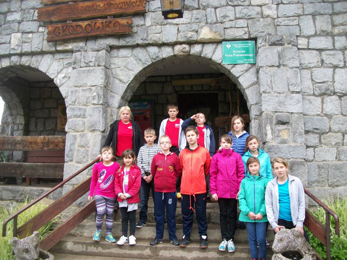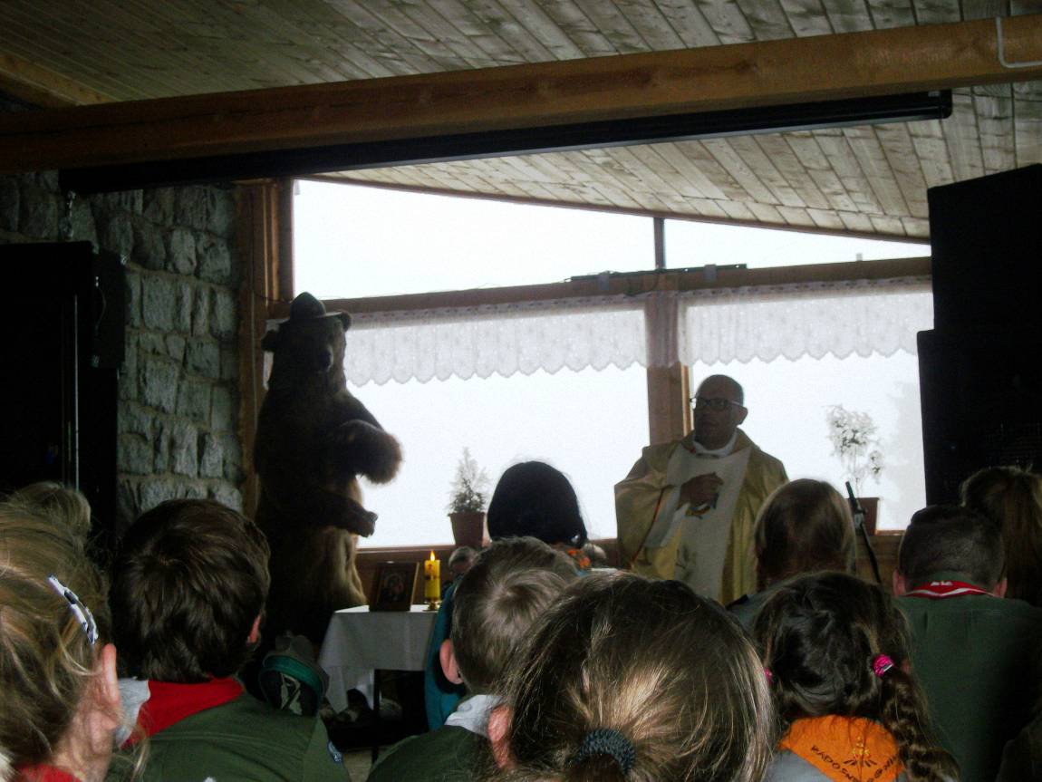 23.05.2015 r. w sobotni poranek wyruszyliśmy w kierunku Tatr. Nieco niepokoiła nas deszczowa pogoda, ale udało nam się przejść przepiękny szlak w Dolinie Kościeliskiej. Dotarliśmy do Schroniska Ornak, skąd po krótkim odpoczynku udaliśmy się czarnym szlakiem do Smreczyńskiego Stawu. Szlak ten stanowił pewne wyzwanie ze względu na to, iż prowadził dość stromo pod górę. Wszystkim zuchom i harcerzom udało się dotrzeć bez przeszkód do zamierzonego celu. Cieszyło nas to, że nie padał deszcz. Następnie udaliśmy się do Schroniska ZHP Głodówka w Bukowinie Tatrzańskiej, gdzie powitał nas sam Komendant Hufca Podhalańskiego harcmistrz Marian Antonik. Zjedliśmy pyszną obiadokolację, zakwaterowaliśmy się w pokojach, a następnie udaliśmy w pełnym umundurowaniu na Mszę Św. harcerską, sprawowaną w Schronisku przez księdza harcmistrza Wojciecha Jurkowskiego, obchodzącego 25 lecie swojego kapłaństwa. Ksiądz odprawiający Mszę Św. z niedźwiedziem w tle, rzadki to widok. Wszyscy uczestnicy Mszy otrzymali pamiątkowe obrazki i zostali poczęstowani pysznym tortem i słodkościami.